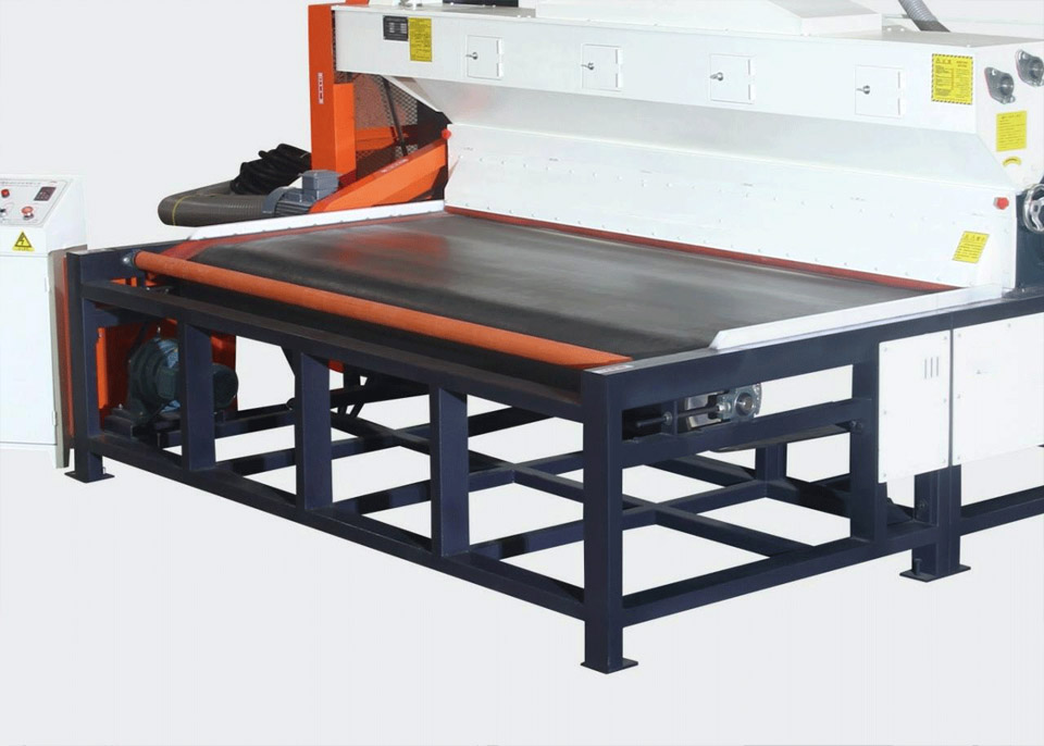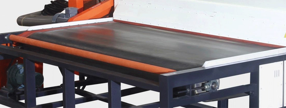Long black conveying belt, which is convenient for conveying big sheet of glass. The conveyor belt adopts integral seamless wear-resistant rubber belt and frequency conversion speed regulation, which greatly reduces the glass scratches during the production process. Thickened material, with a service life of over ten years.