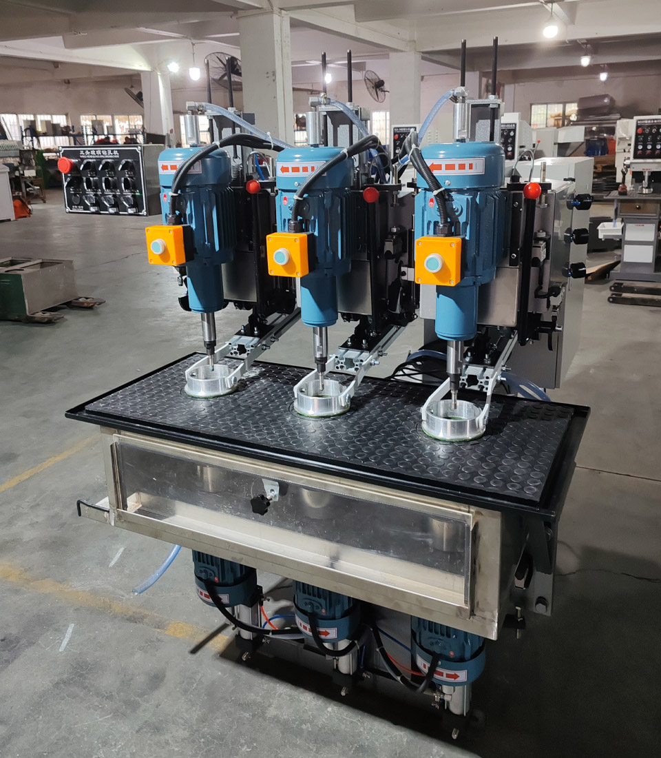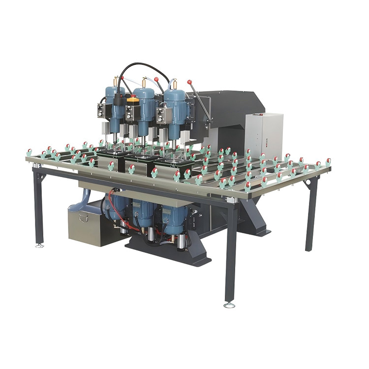 The equipment can efficiently batch process products with multiple different apertures on a piece of glass, avoiding the need to constantly change drill bits. It saves space and labor compared to three single-head drilling machines, and has a more competitive price. It has a simple structure, convenient maintenance, and easy operation. The working floating table can be pneumatically raised and lowered. The machine works in the motor-driven direct feed mode, and the drill bit speed can be adjusted by adding a frequency converter. It is suitable for drilling holes in flat glass as well as cylindrical decorative glass such as glass cups and lamps.